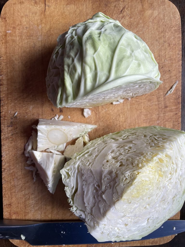 Para esta receta es mejor cortar el repollo en trozos bastante grandes. Tras eliminar el corazón, se pueden cortar las hojas en pedazos de unos tres o cuatro centímetros y luego separarlas ligeramente con las manos. De este modo el repollo se cuece rápidamente pero sigue estando crujiente.
