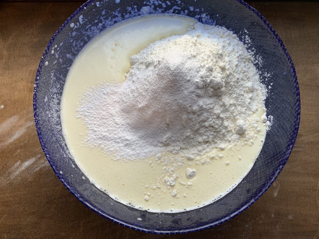 Agregad a la mezcla la harina y la levadura en polvo.