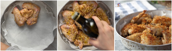 Espolvorea la superficie de las alitas de pollo con otro chorro de aceite e introduce todo en el horno ventilado a 190° durante 40 minutos.