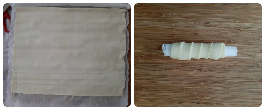 • Enrolla cada tira sobre los cilindros de papel de horno, y luego colócalos sobre una bandeja también cubierta de papel de horno.