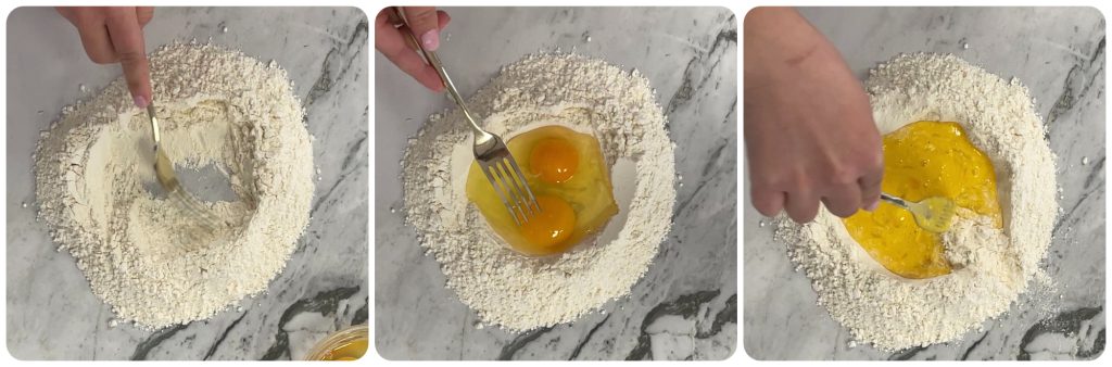 Comenzad a batir los huevos con el tenedor y poco a poco empezad a recoger la harina circundante.