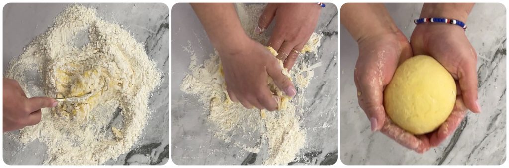 Continuad amasando con el tenedor, luego, cuando la masa esté más consistente, comenzad a amasar a mano hasta obtener un bollo liso y homogéneo.