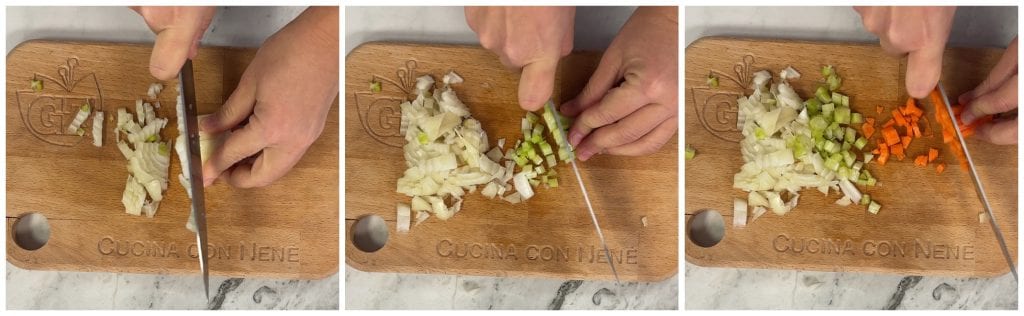 Limpiad la cebolla, la zanahoria y el apio y picadlos muy finamente con un cuchillo.