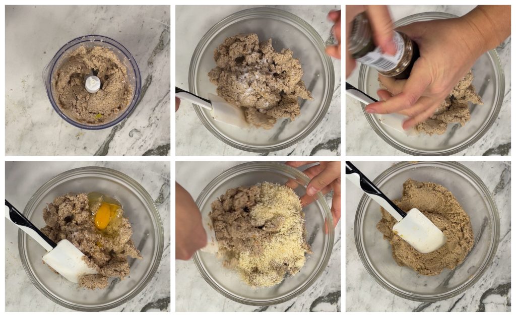 Verted el relleno en un bol, añadid sal, pimienta, nuez moscada y el huevo. Dad una primera mezclada y por último añadid el huevo. Mezclad con una cuchara o espátula para obtener un relleno homogéneo y bien amalgamado.