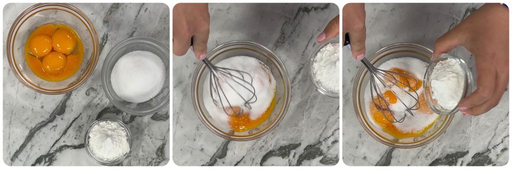 • En un bol, mezcla las yemas con el azúcar y la harina, o con la maicena.