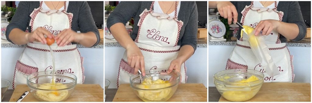 • Cuando la masa esté fría, comienza a añadir los huevos, uno a uno, mezclando y siempre dejando que se absorba el primer huevo antes de añadir el segundo.