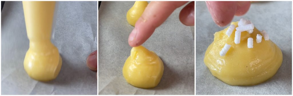 Con los dedos húmedos, luego, elimina la punta que se creará con la manga pastelera.
