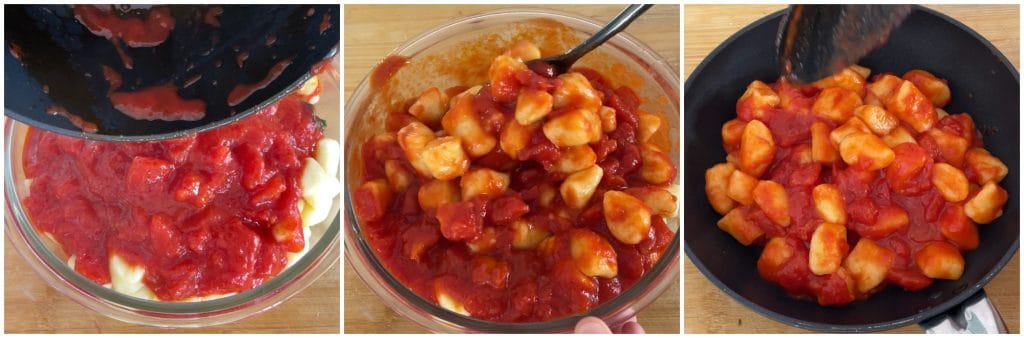 • Condimenta los gnocchi a la sorrentina en sartén con la salsa de tomate y mezcla para combinar.