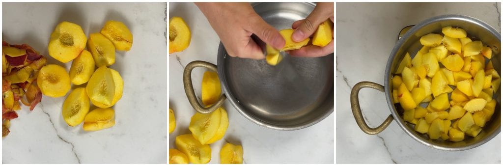 Corta los melocotones en dados pequeños y colócalos en una olla grande.