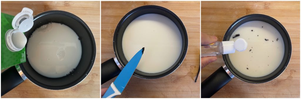 Añade las semillas de un trozo de la vaina de vainilla a la leche desnatada.