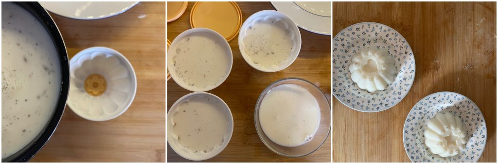 Distribuye la mezcla para el pudin proteico en los moldes, luego deja enfriar a temperatura ambiente, y después transfiérelos al frigorífico para que se endurezcan completamente.