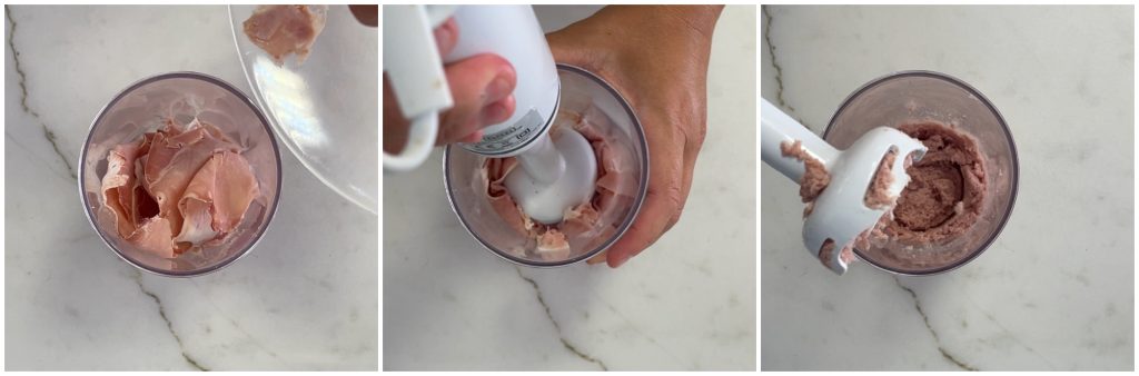 • Coloca las lonchas de jamón cocido dentro de una licuadora o un vaso de bordes altos, y tritura hasta obtener un puré homogéneo.