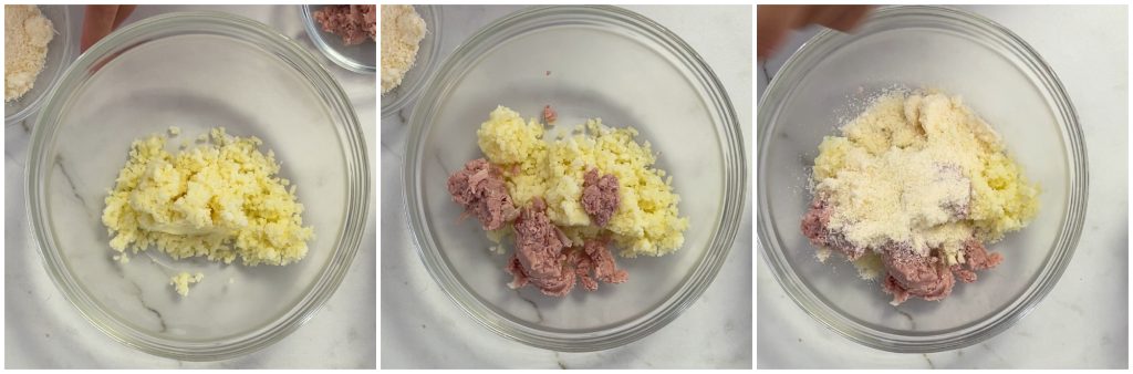 Coloca todo en un bol, añade el jamón cocido y el Parmigiano Reggiano rallado.