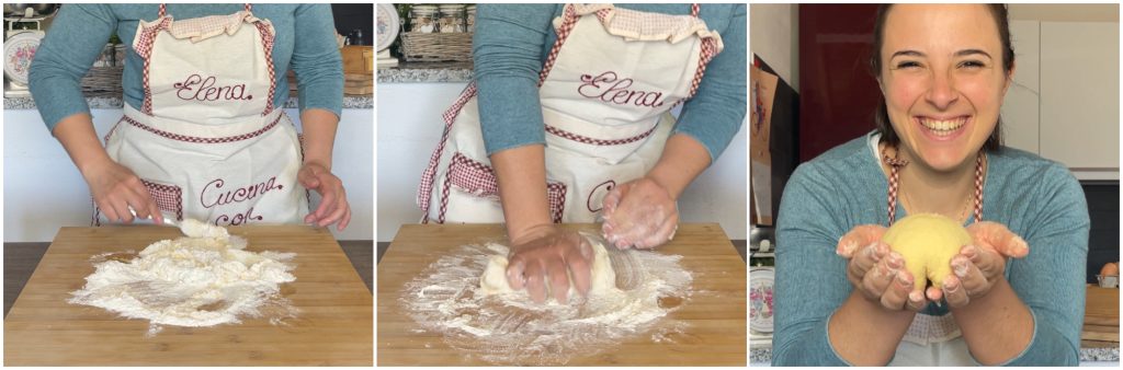Comenzad a recoger la harina circundante con el tenedor y cuando la masa comience a volverse más consistente, comenzad a amasar a mano.