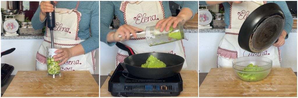 Cuando las verduras estén cocidas, recolectadlas en un vaso, trituradlas con un minipimer y luego volved a transferirlas a la sartén para secarlas del exceso de humedad.