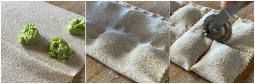 Sellad bien los bordes alrededor de los montoncitos de relleno y luego cortad vuestros raviolis.