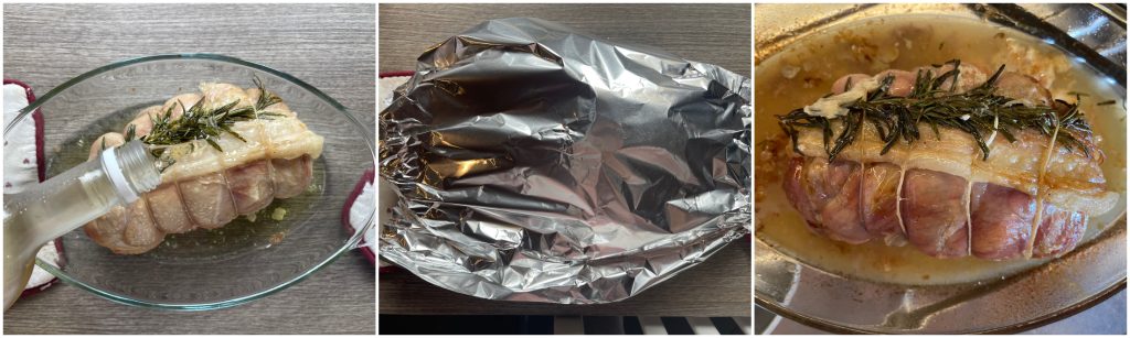 Terminados los primeros 10 minutos de cocción, sacad el rollo y bañadlo con el vino blanco.
