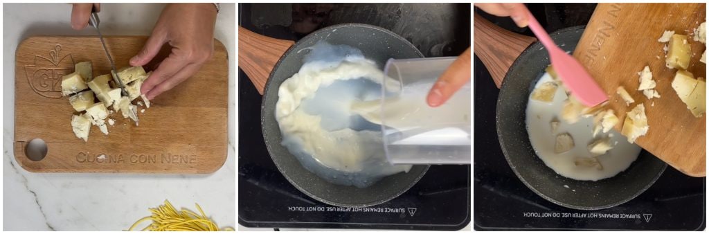 • Elimina la corteza del Castelmagno y córtalo en cubos de tamaño medio.
