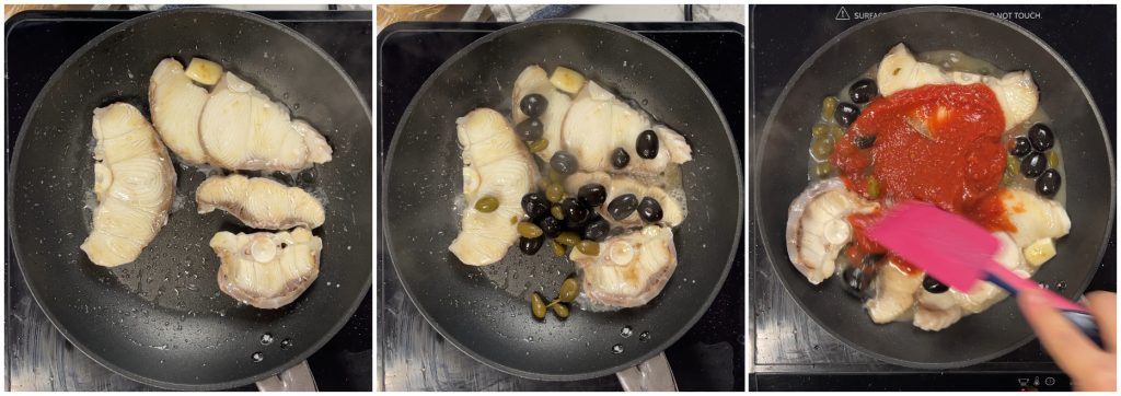 Cuece las rodajas de tintorera en la sartén a fuego alto, luego agrega las aceitunas negras y las alcaparras y rocía con vino blanco.
