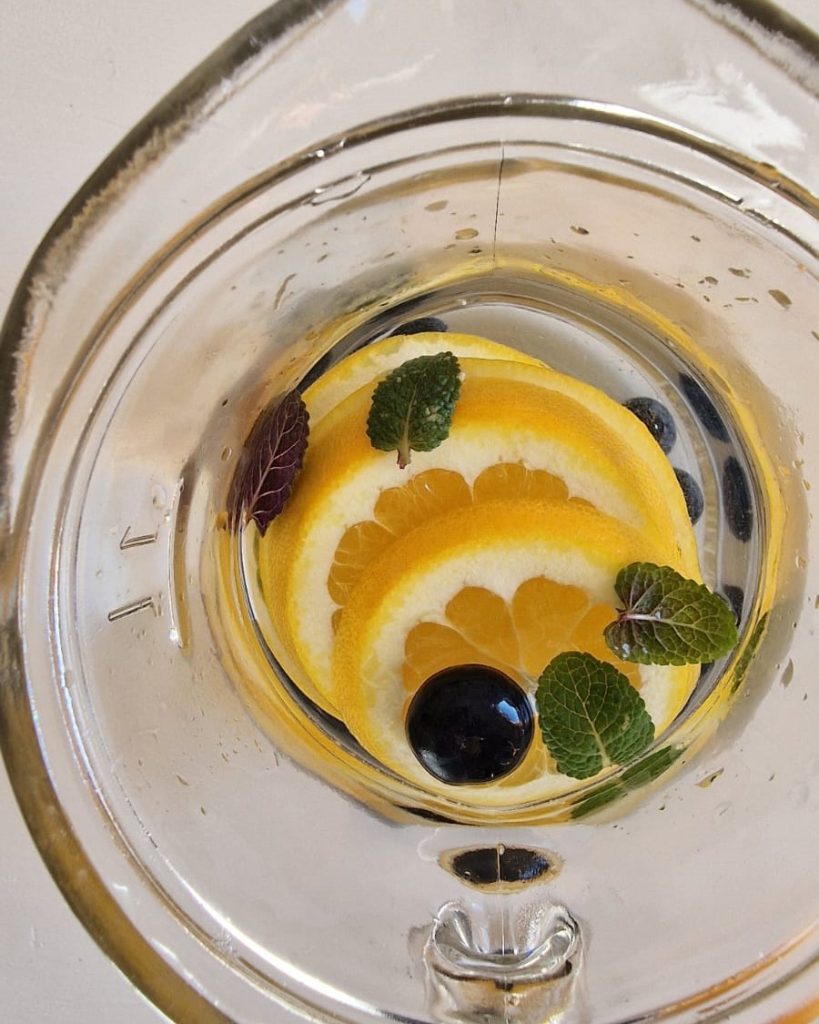 Vierte el agua fría (normalmente 1 litro) en una jarra, añade los arándanos, las rodajas de naranja y las hojas de menta.
