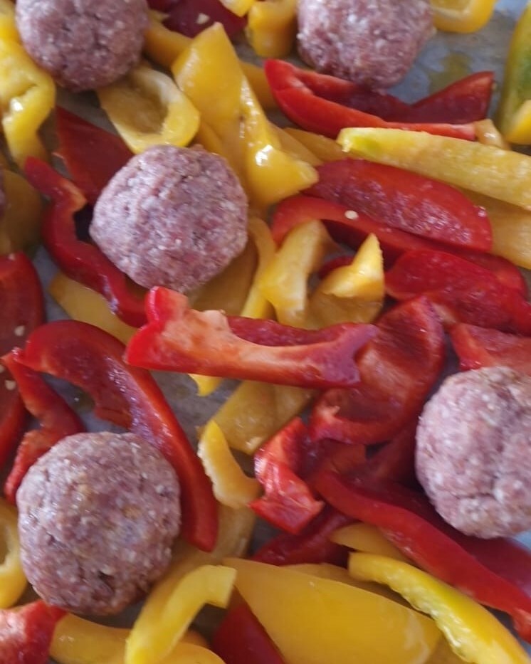 Pasad los pimientos junto con las albóndigas a una bandeja forrada con papel de horno y hornead a 180°C durante unos 35 minutos. Antes de terminar la cocción, girad tanto las verduras como la carne para obtener una cocción homogénea.