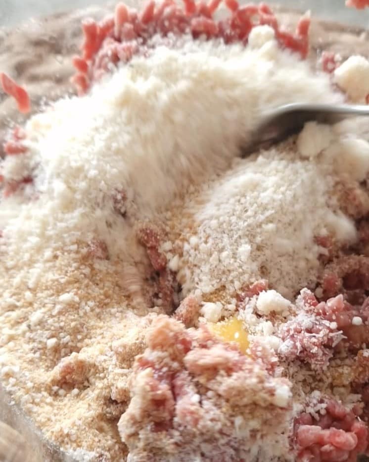 En un bol grande poned la carne picada, el huevo, la sal, el parmesano rallado, el pan rallado y la leche, mezclad bien con las manos hasta amalgamar todos los ingredientes. Alternativamente, también podéis usar la batidora con el gancho amasador.