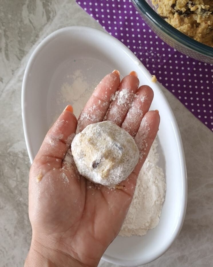 Toma un poco de masa y con las manos ligeramente húmedas, forma las albóndigas de berenjena. «Aproximadamente 30g cada albóndiga.» Pásalas por harina.