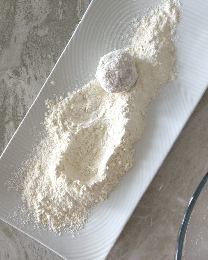 Toma una pequeña parte de carne y forma pequeñas bolitas, dándoles forma con las manos. Luego pásalas por harina.