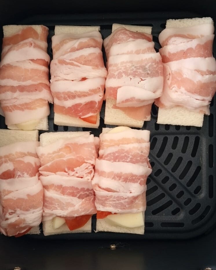 En este punto, envuelve una o dos rebanadas de panceta alrededor del pan.