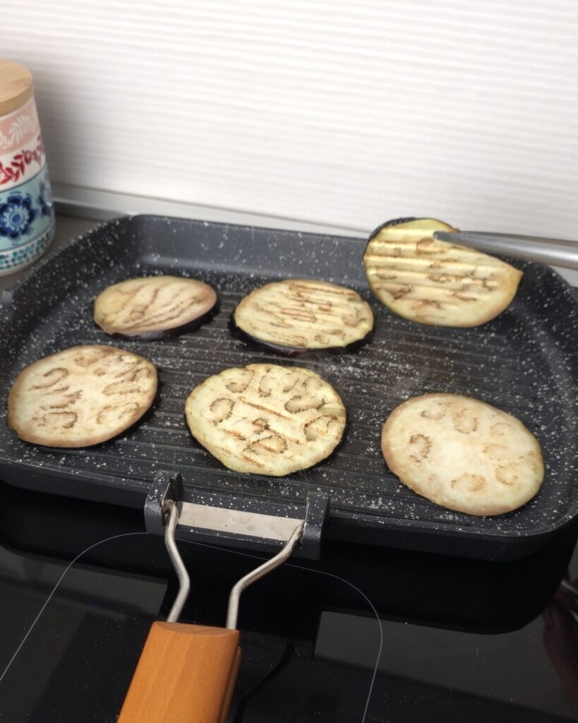Comienza cortando las berenjenas en rodajas, luego colócalas sobre la parrilla y ásalas por ambos lados, sazona con sal al gusto.