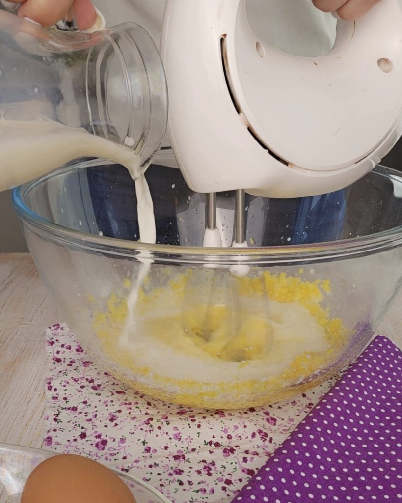 A continuación, añadid el aceite poco a poco en hilo y luego la leche a temperatura ambiente (no fría).