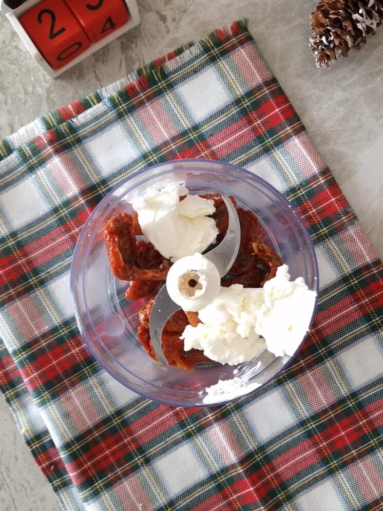 Preparación de la salsa con los tomates secos: coloca en una batidora los tomates escurridos triturándolos con unas gotas de tabasco, finalmente añade un poco de Philadelphia y mezcla.