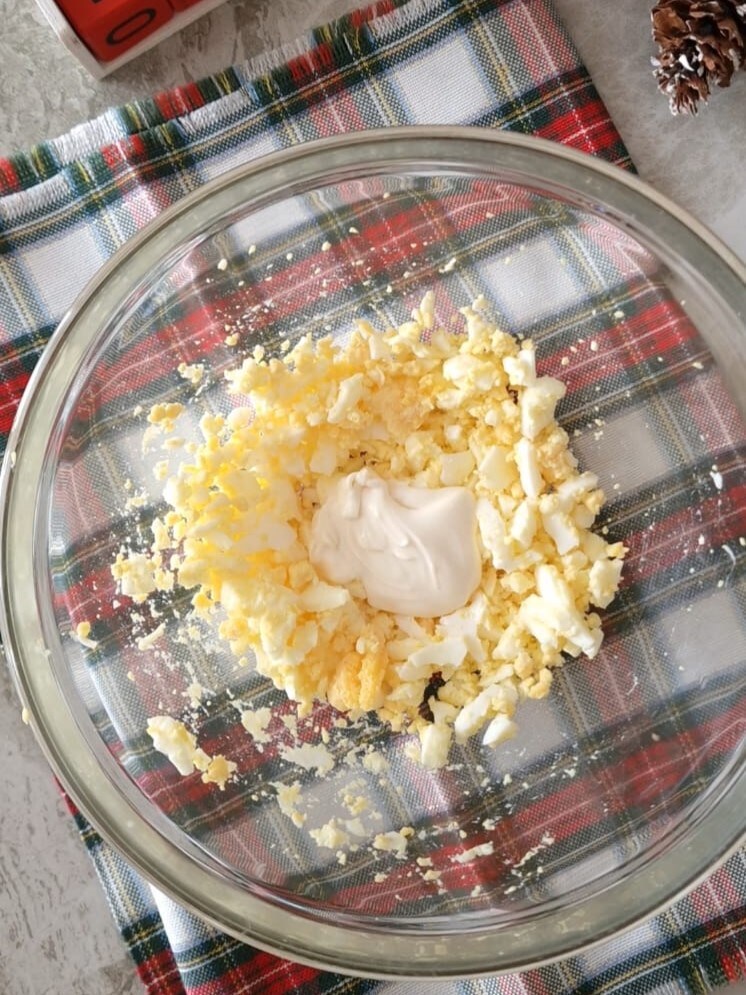 Comienza preparando la salsa de huevo duro de esta manera: debes hervir los huevos en abundante agua. Tan pronto como empiece a hervir, cuécelos durante 9 minutos, enfríalos en agua fría, pélalos y transfiérelos a un bol junto con la mayonesa.