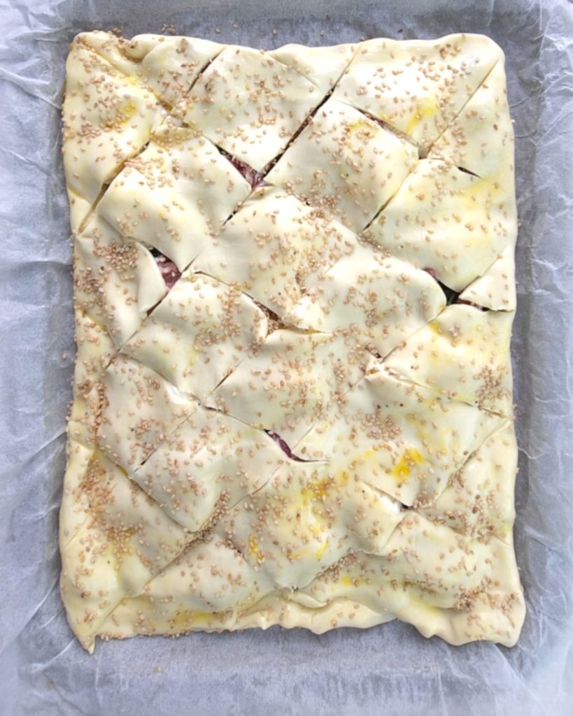 Pincela la superficie con el huevo batido y adorna con algunas semillas de sésamo.