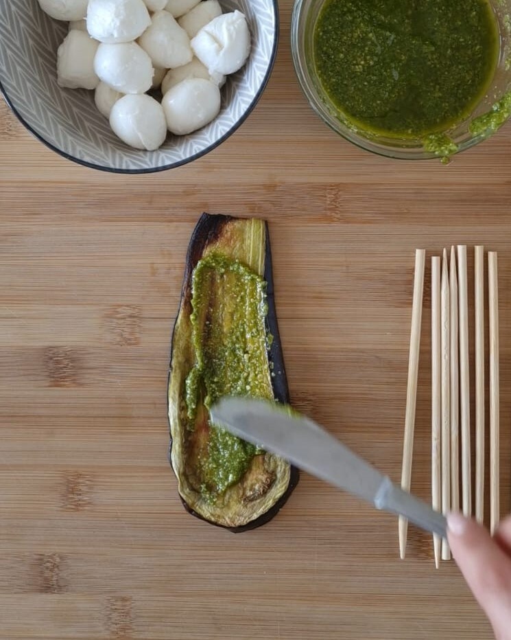 Brochetas de berenjenas a la parrilla fáciles y rápidas, la receta es perfecta para preparar con antelación, ideales para una cena de verano. Se trata de berenjenas a la parrilla, enriquecidas con un relleno delicioso de pesto de albahaca y speck, todo montado en un palillo a modo de brocheta.