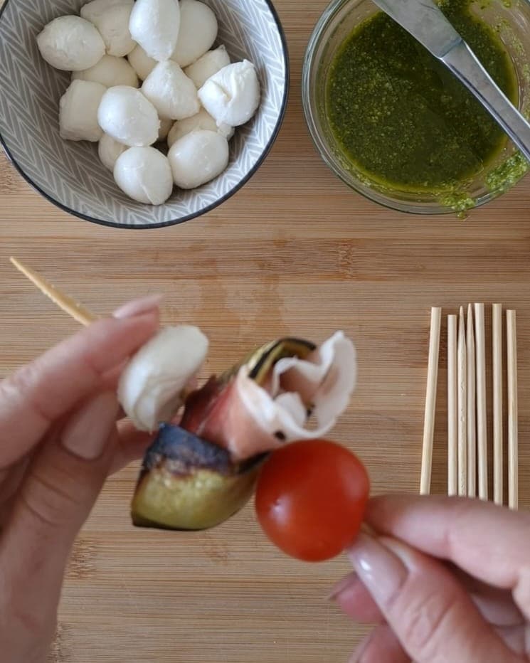 • Toma los palillos y ensarta primero un tomatito, luego los rollitos de berenjenas alternando con las bolitas de mozzarella.
