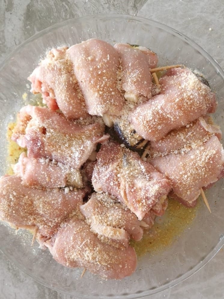 Luego enrolla y crea tus rollitos, continúa hasta terminar con el resto de los ingredientes. Ensarta todos los rollitos en brochetas, luego adereza con un poco de aceite, pan rallado y una pizca de parmigiano.