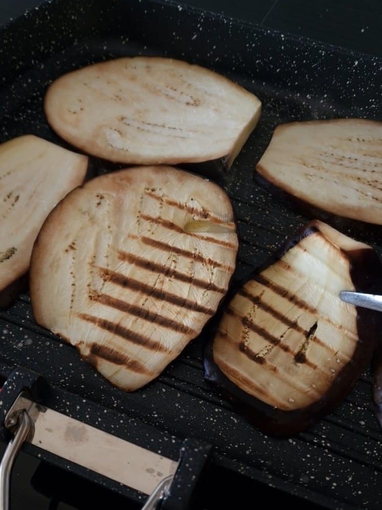 Corta las berenjenas en rodajas, luego ásalas en una sartén antiadherente con sal y reserva.