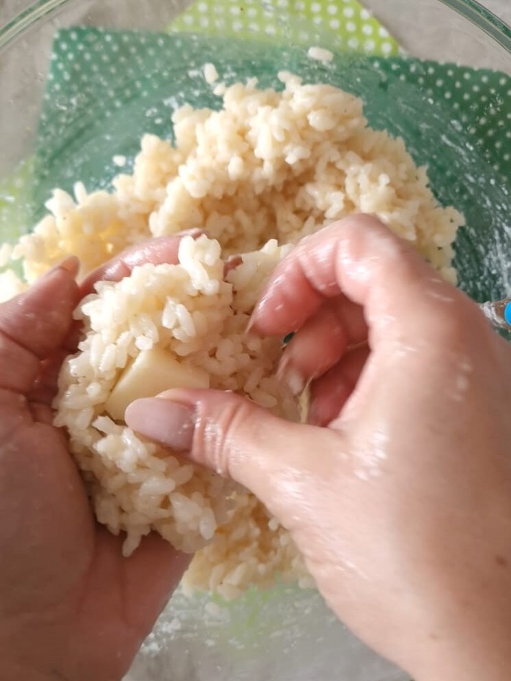 Transcurrido el tiempo de enfriamiento dividid el arroz en aproximadamente 11-12 porciones, tomad una, aplastadla ligeramente con las manos ligeramente mojadas en agua, dándole una forma redondeada. Rellenad el centro con la scamorza.