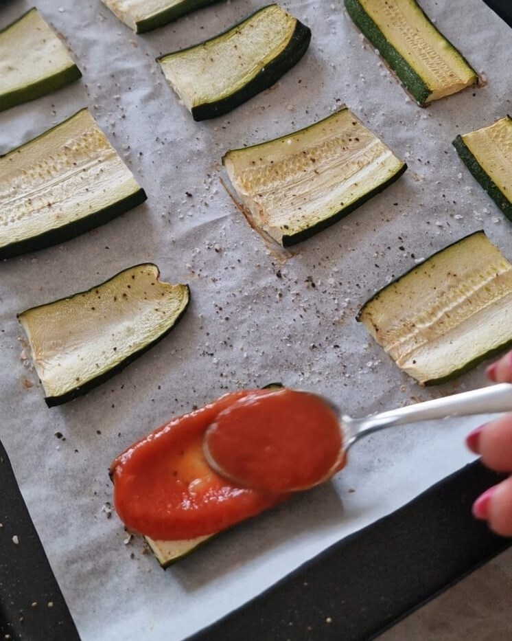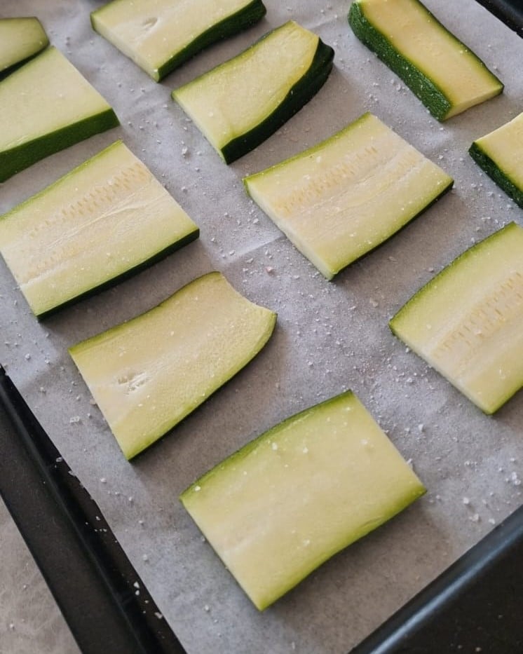 Colocadlos en una bandeja forrada con papel de horno, sazonad los calabacines con sal y pimienta. Cocinad los calabacines a 190°C durante unos 10-15 minutos.