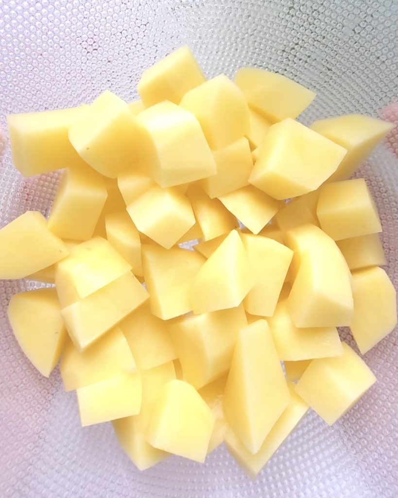 Haz lo mismo con las patatas, pélalas y córtalas en trozos.