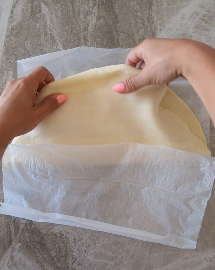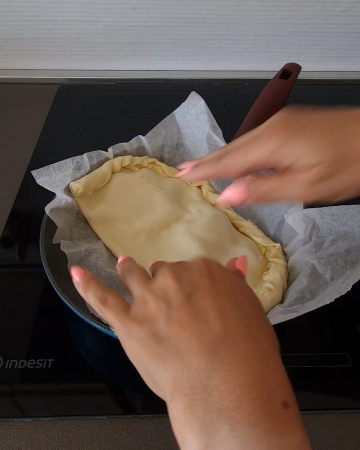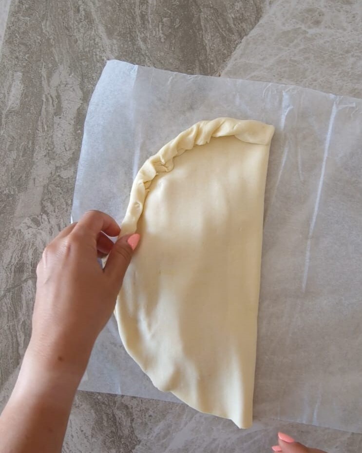 Cierra el calzone cubriendo el relleno con la otra mitad del hojaldre, luego sella bien los bordes.