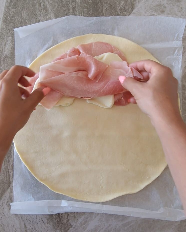 Desenrolla el hojaldre, dejando su papel debajo, luego rellena con el jamón cocido y el queso cortado en lonchas.