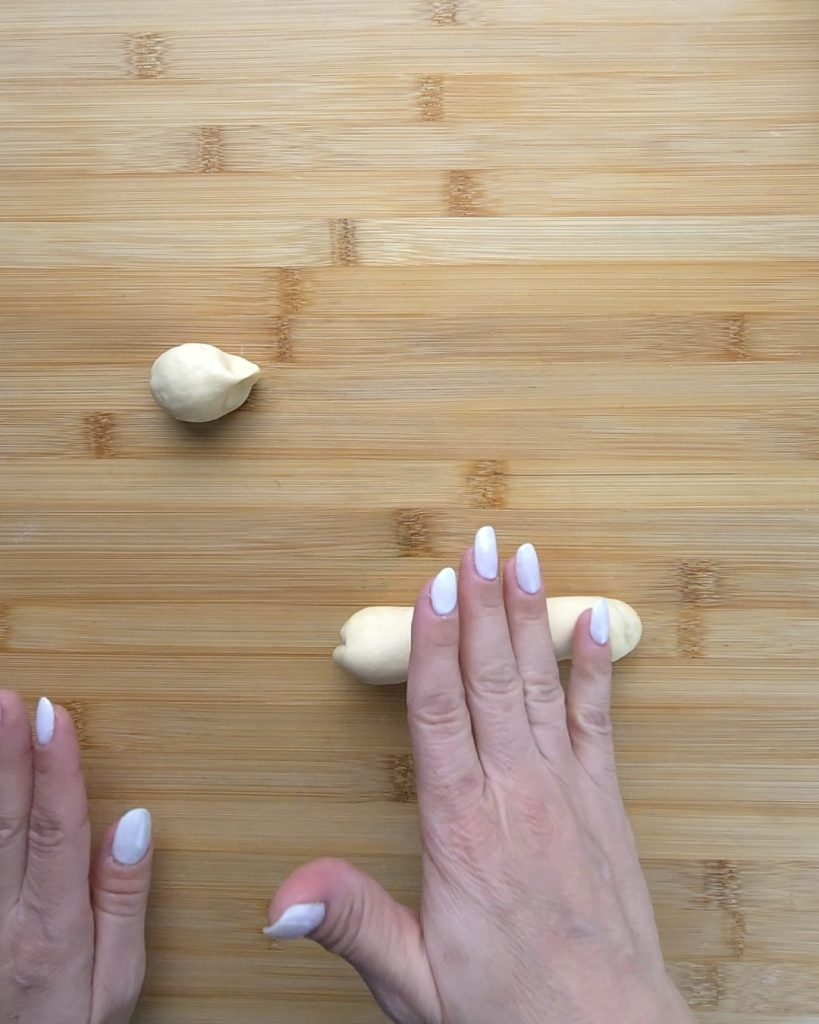 La segunda parte deberá pesar unos 70 g y será el cuerpo; formad un rulo y luego haced un nudo.