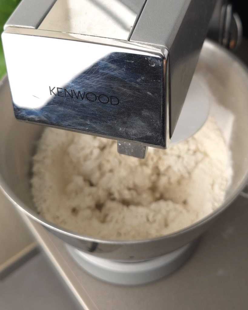 En el bol de la amasadora, echad primero la harina, la levadura y el azúcar, poned en marcha la máquina. A continuación, con la máquina en funcionamiento, añadid el resto de ingredientes.