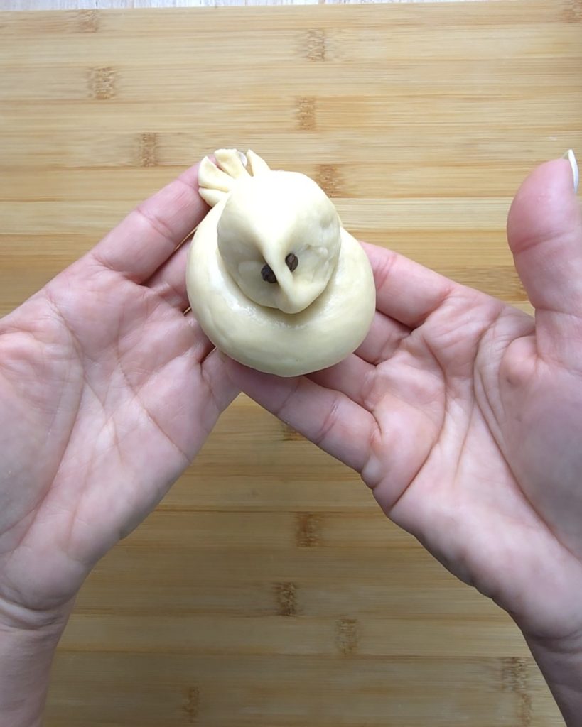 Colocad la cabeza de la colombina sobre el cuerpo, ligeramente humedecida con agua; a continuación haced los ojitos con los granos de pimienta.