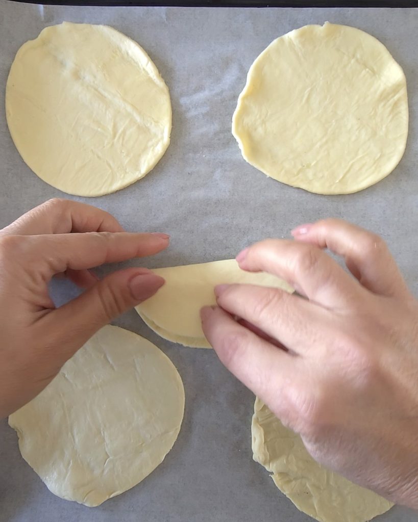 Cierra a la mitad cada disco, sin presionar demasiado fuerte en el pliegue (de lo contrario se pegará durante la cocción). Pincela la superficie de cada semicírculo con huevo batido.