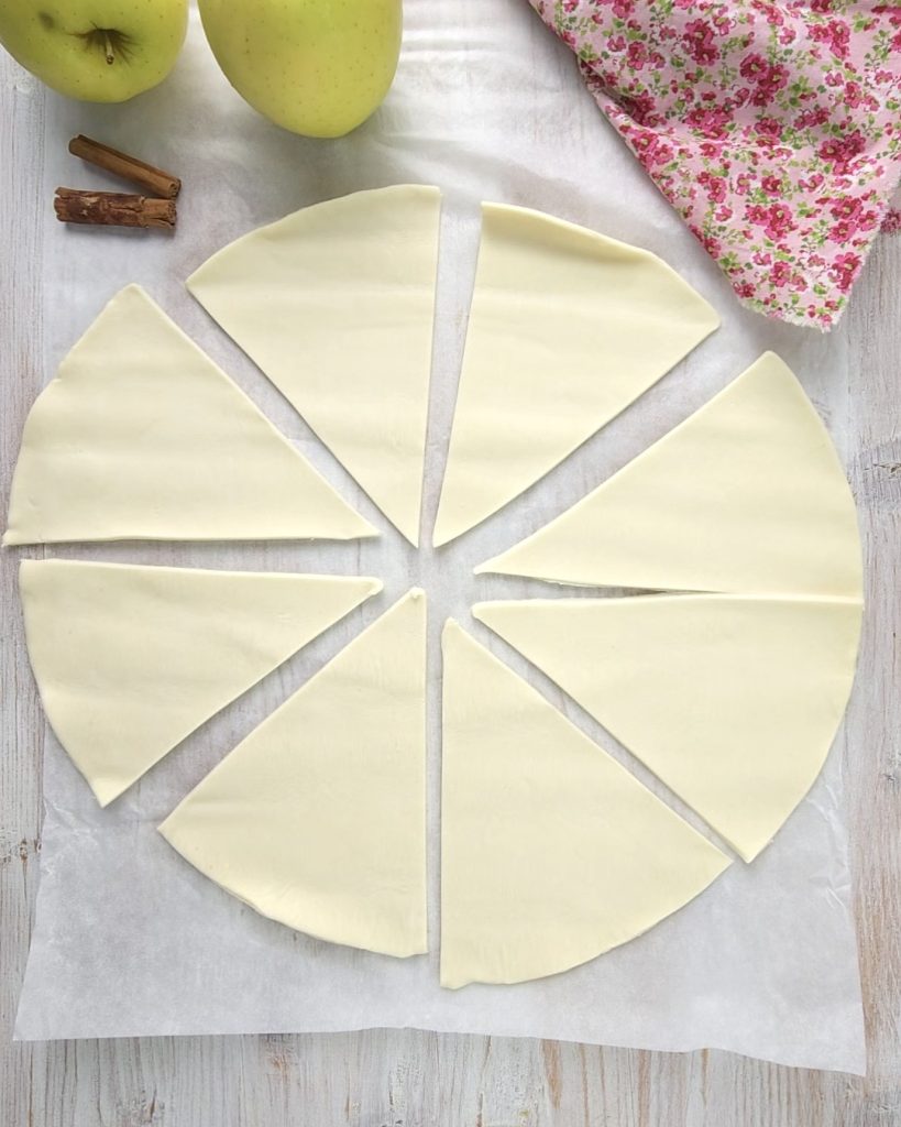 Desenrolla la masa de hojaldre redonda sobre una superficie de trabajo y divídela en porciones, obteniendo un máximo de 8 triángulos.