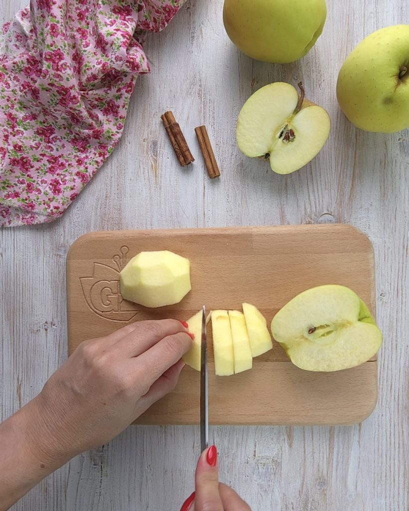 Comienza con las manzanas: obviamente, pélalas y quítales el corazón, luego córtalas en cubos.