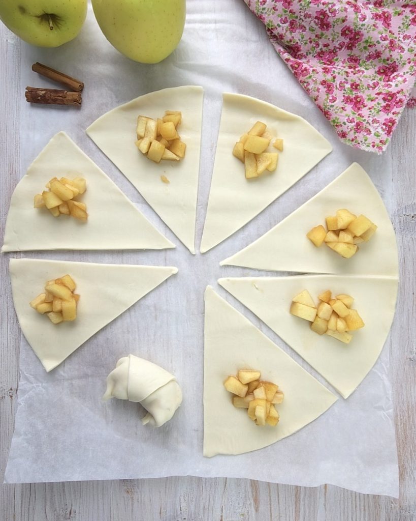 Coloca las manzanas cocidas sobre cada porción y luego enrolla formando un croissant.